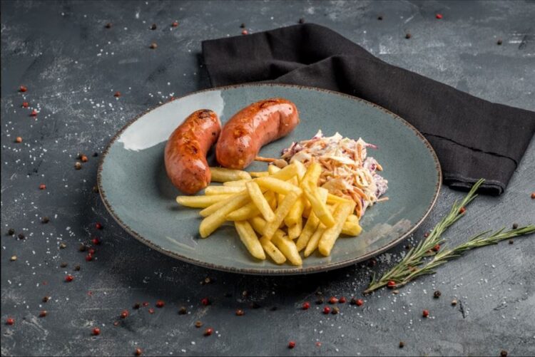 Колбаски говяжьи, салат Куол-слоу, картофель фри