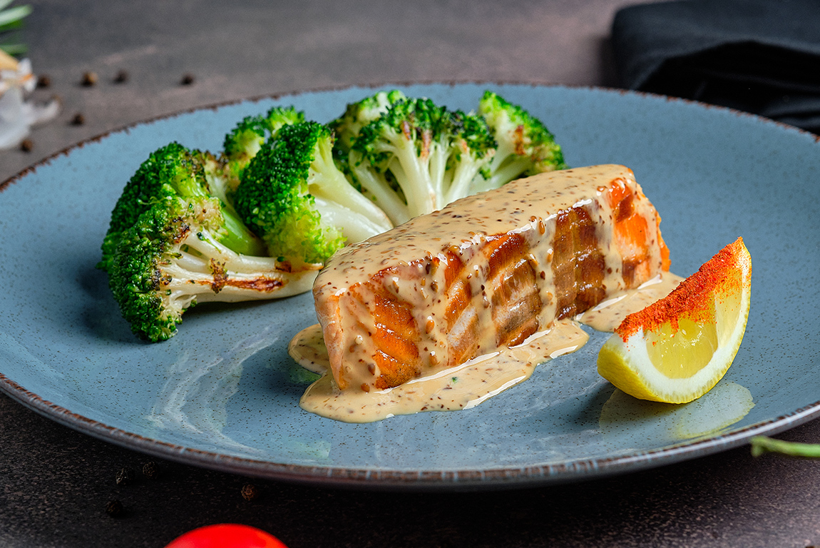 Стейк из семги, обжаренный на гриле, кунжутный соус, капуста брокколи, лимон