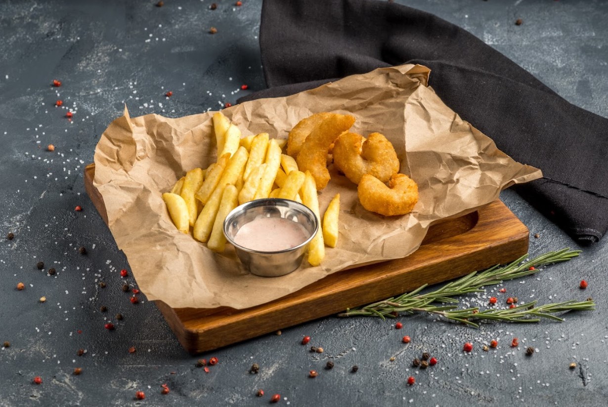 Тигровые креветки в хрустящей панировке, картофель фри, соус Ранч (кефир, майонез, луковый порошок, чесночный порошок, зелень петрушки)